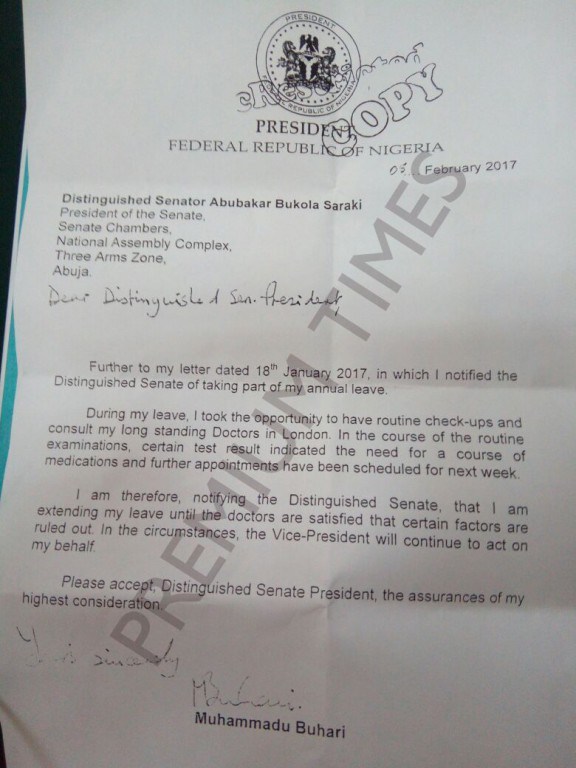 “… I am extending my leave until the doctors are satisfied that certain factors are ruled out,” Mr. Buhari said in a February 5 letter to the President of the Senate, Bukola Saraki, informing the National Assembly of the extension of his vacation. The letter was exclusively obtained by Premium Times today.